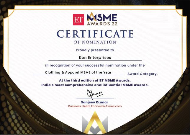 KEN INDIA is nominated for one of the most prestigious awards "ET MSME Awards 2022" in the category "Clothing & Apparel MSME of the Year".